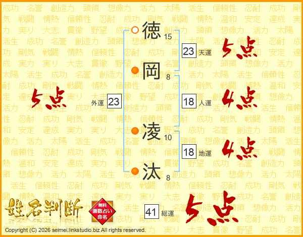 徳(15画)岡(8画) 凌(10画)汰(8画)