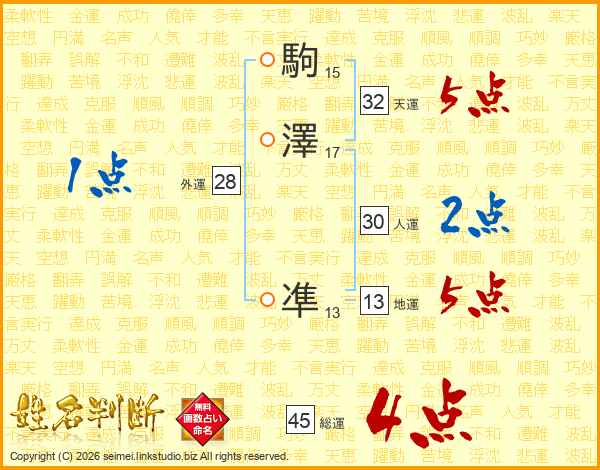 駒澤凖さんの総運は45画の4点!