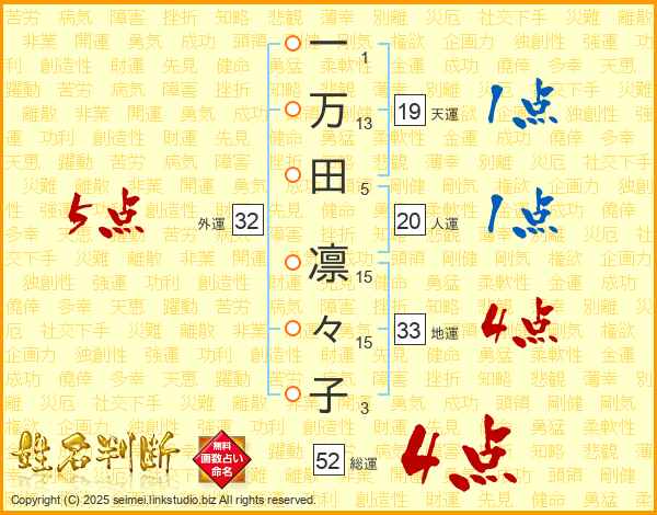 一(1画)万(13画)田(5画) 凛(15画)々(15画)子(3画)