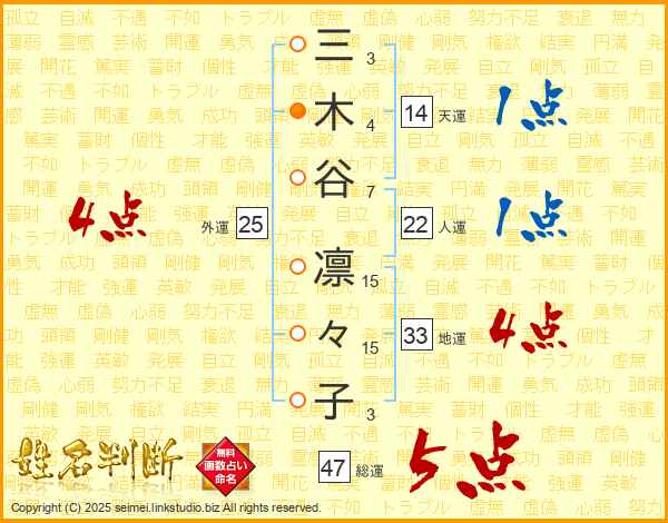三(3画)木(4画)谷(7画) 凛(15画)々(15画)子(3画)