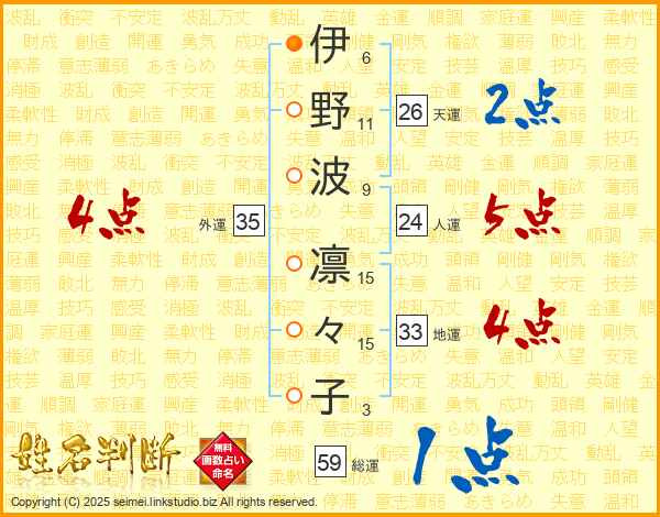 伊(6画)野(11画)波(9画) 凛(15画)々(15画)子(3画)