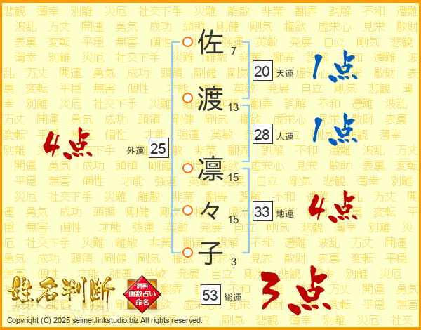 佐(7画)渡(13画) 凛(15画)々(15画)子(3画)
