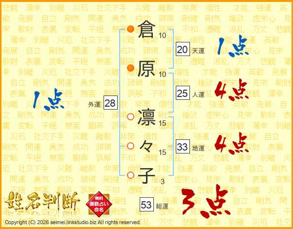 倉(10画)原(10画) 凛(15画)々(15画)子(3画)
