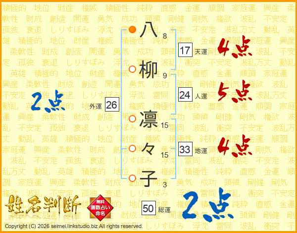 八(8画)柳(9画) 凛(15画)々(15画)子(3画)