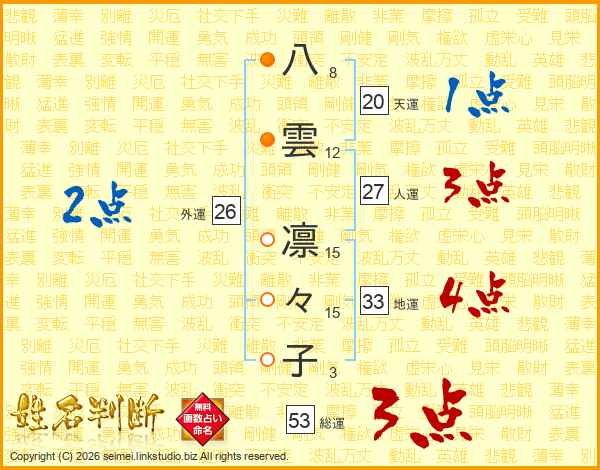 八(8画)雲(12画) 凛(15画)々(15画)子(3画)