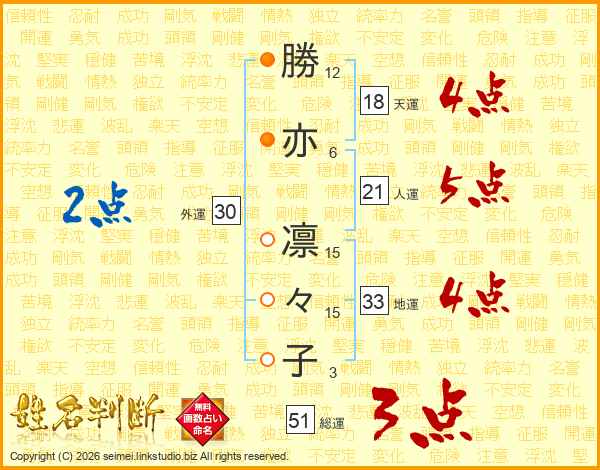 勝(12画)亦(6画) 凛(15画)々(15画)子(3画)