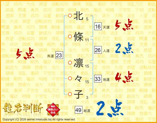 北(5画)條(11画) 凛(15画)々(15画)子(3画)