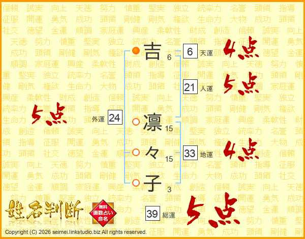 生活面を象徴する運勢です。外部から受ける影響力を表し、結婚運、家庭運や職場、環境への順応性を表します。総運から人運を引いた画数。姓や名が1文字の場合を除く。