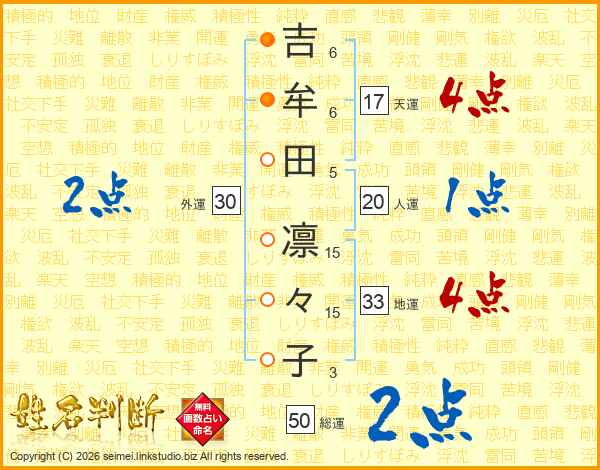 吉(6画)牟(6画)田(5画) 凛(15画)々(15画)子(3画)