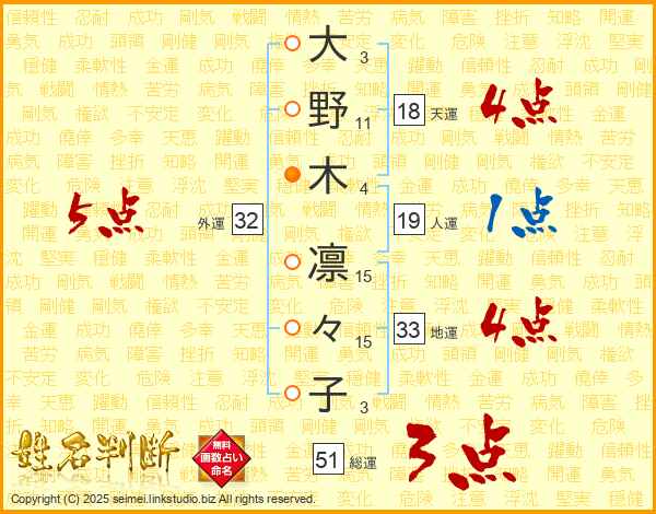 大(3画)野(11画)木(4画) 凛(15画)々(15画)子(3画)