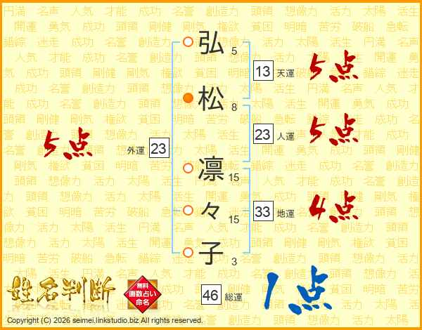 弘(5画)松(8画) 凛(15画)々(15画)子(3画)