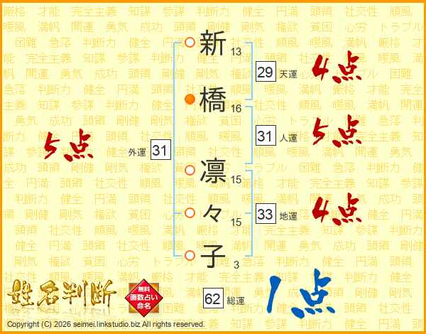 新(13画)橋(16画) 凛(15画)々(15画)子(3画)