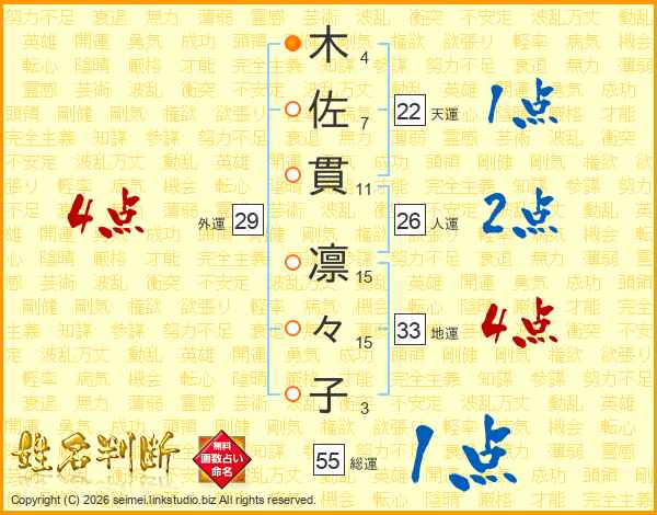 木(4画)佐(7画)貫(11画) 凛(15画)々(15画)子(3画)
