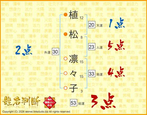 植(12画)松(8画) 凛(15画)々(15画)子(3画)