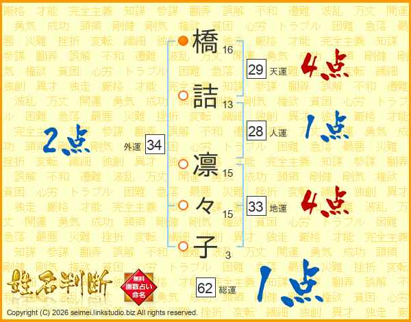 橋(16画)詰(13画) 凛(15画)々(15画)子(3画)