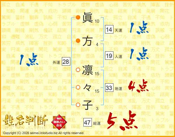 眞(10画)方(4画) 凛(15画)々(15画)子(3画)