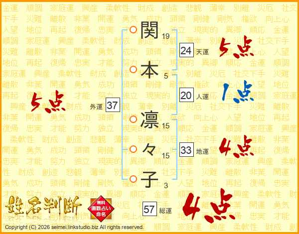 関(19画)本(5画) 凛(15画)々(15画)子(3画)