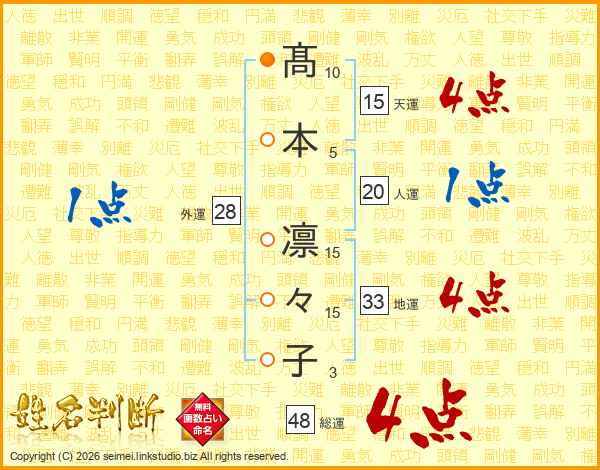 髙(10画)本(5画) 凛(15画)々(15画)子(3画)
