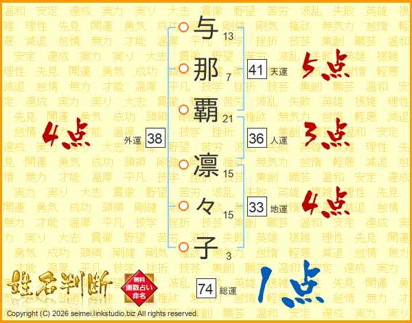 与(13画)那(7画)覇(21画) 凛(15画)々(15画)子(3画)