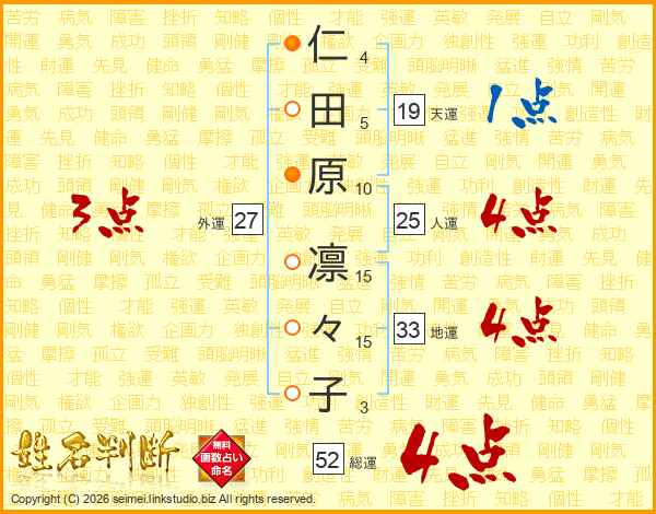 仁(4画)田(5画)原(10画) 凛(15画)々(15画)子(3画)