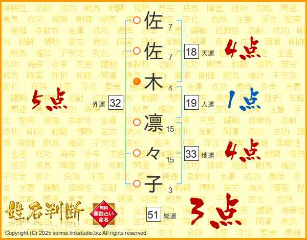 佐(7画)佐(7画)木(4画) 凛(15画)々(15画)子(3画)