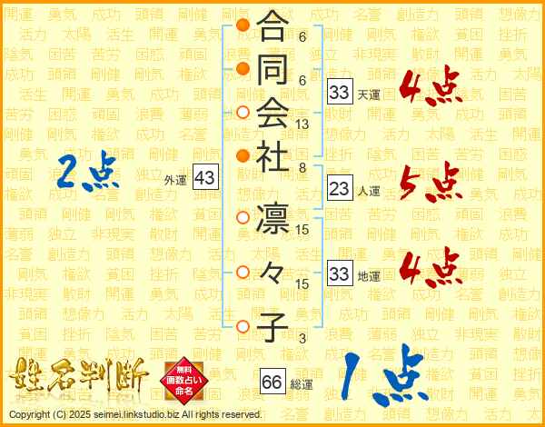 合(6画)同(6画)会(13画)社(8画) 凛(15画)々(15画)子(3画)