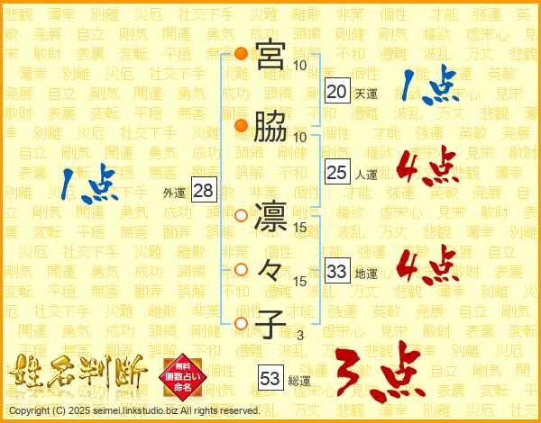 宮(10画)脇(10画) 凛(15画)々(15画)子(3画)