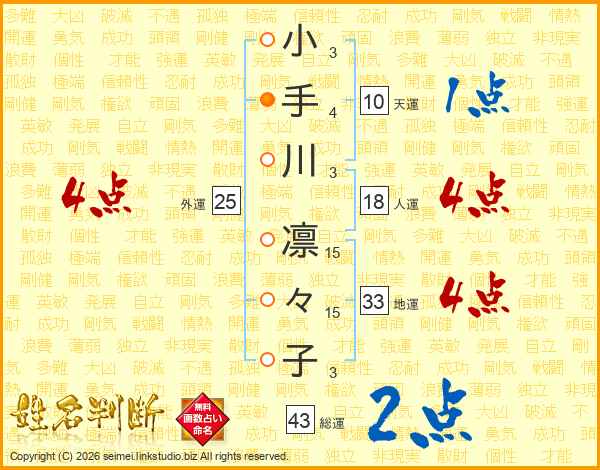 小(3画)手(4画)川(3画) 凛(15画)々(15画)子(3画)