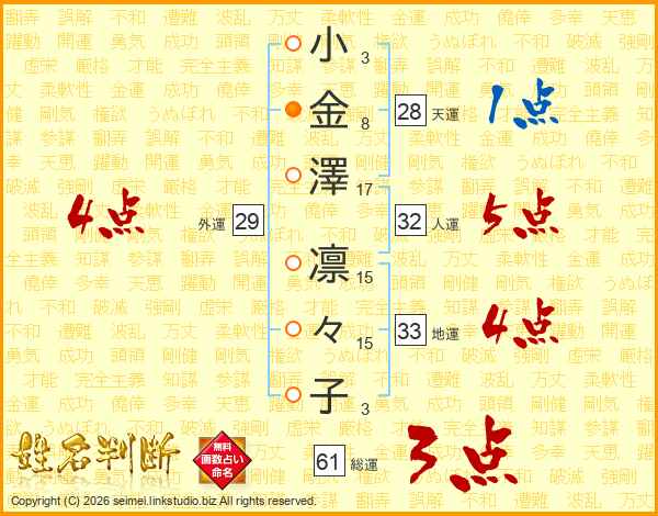小(3画)金(8画)澤(17画) 凛(15画)々(15画)子(3画)