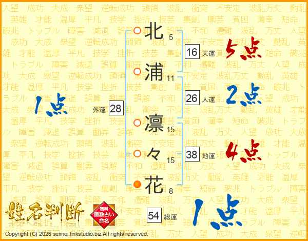 北(5画)浦(11画) 凛(15画)々(15画)花(8画)