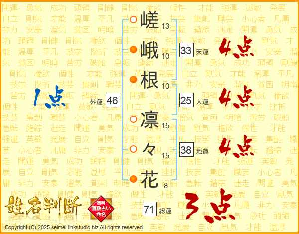 嵯(13画)峨(10画)根(10画) 凛(15画)々(15画)花(8画)