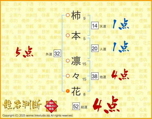 柿(9画)本(5画) 凛(15画)々(15画)花(8画)