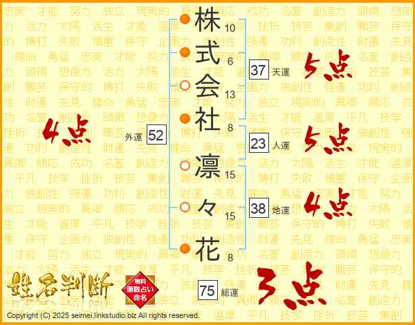 株(10画)式(6画)会(13画)社(8画) 凛(15画)々(15画)花(8画)