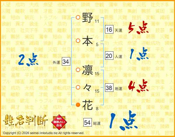 野(11画)本(5画) 凛(15画)々(15画)花(8画)