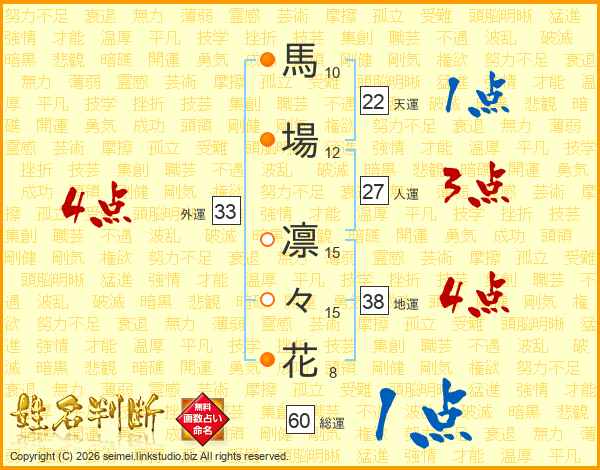 馬(10画)場(12画) 凛(15画)々(15画)花(8画)