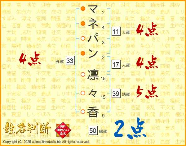マ(2画)ネ(4画)パ(3画)ン(2画) 凛(15画)々(15画)香(9画)