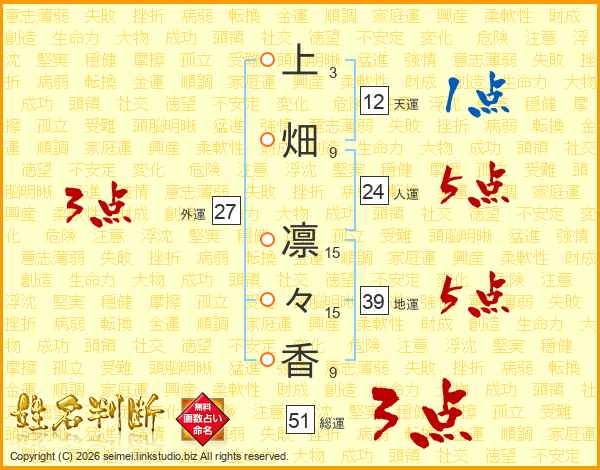 上(3画)畑(9画) 凛(15画)々(15画)香(9画)