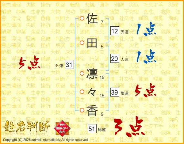 佐(7画)田(5画) 凛(15画)々(15画)香(9画)