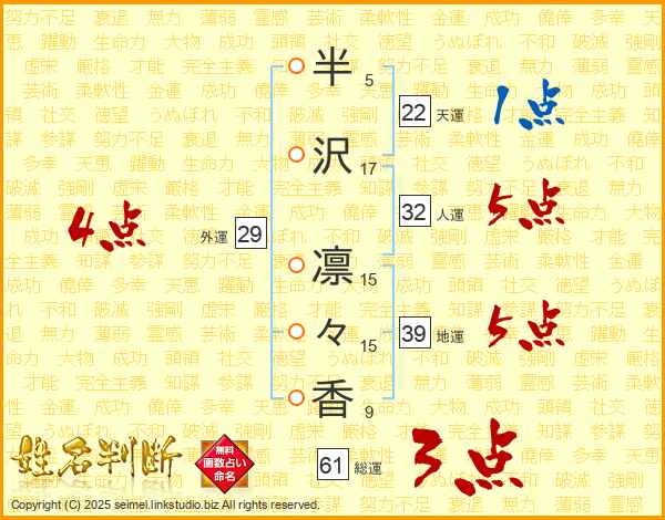半(5画)沢(17画) 凛(15画)々(15画)香(9画)