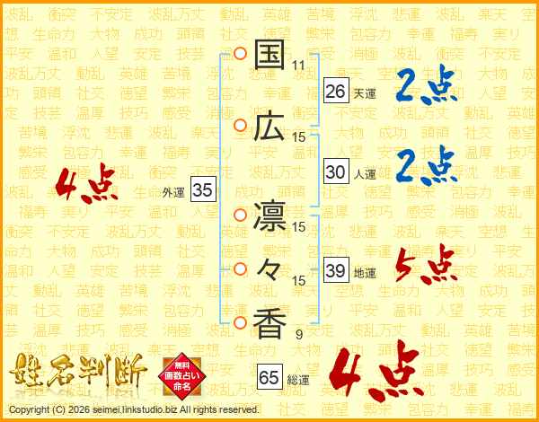 国(11画)広(15画) 凛(15画)々(15画)香(9画)