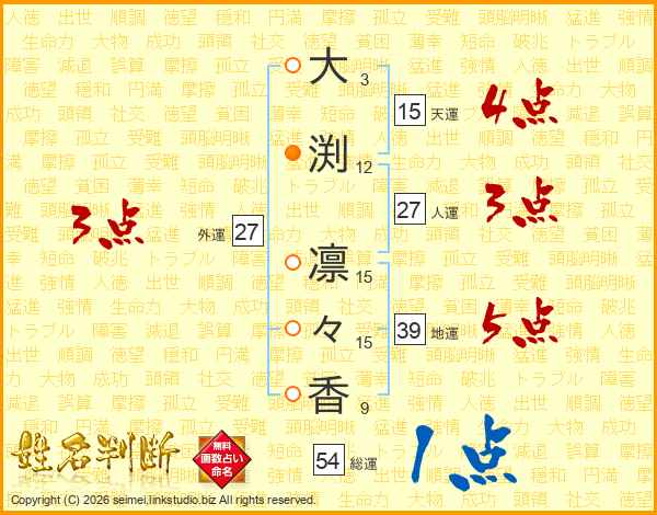 大(3画)渕(12画) 凛(15画)々(15画)香(9画)