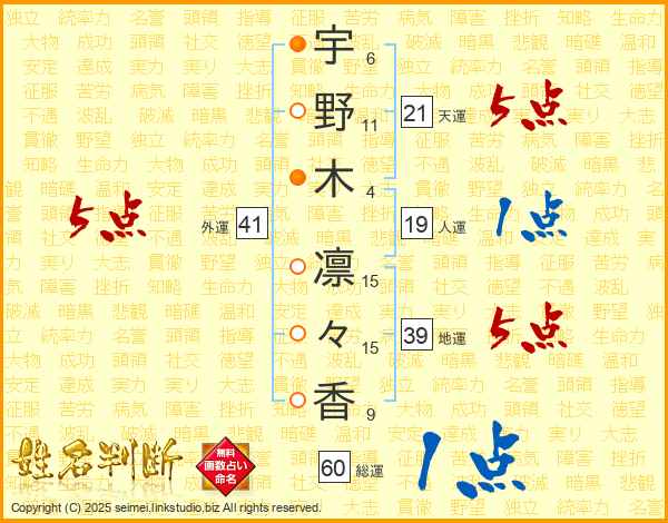宇(6画)野(11画)木(4画) 凛(15画)々(15画)香(9画)
