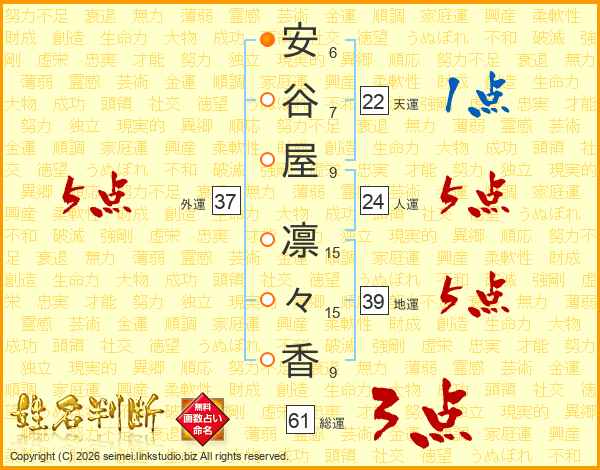 安(6画)谷(7画)屋(9画) 凛(15画)々(15画)香(9画)