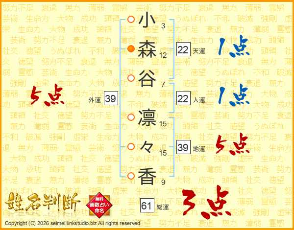 小(3画)森(12画)谷(7画) 凛(15画)々(15画)香(9画)