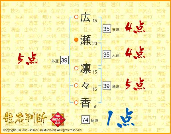 広(15画)瀬(20画) 凛(15画)々(15画)香(9画)