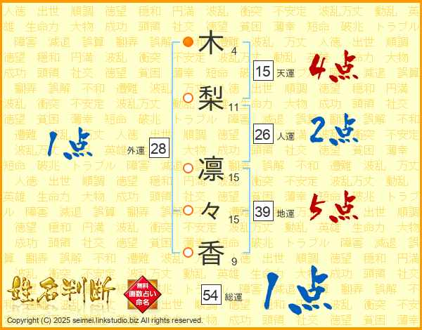 木(4画)梨(11画) 凛(15画)々(15画)香(9画)