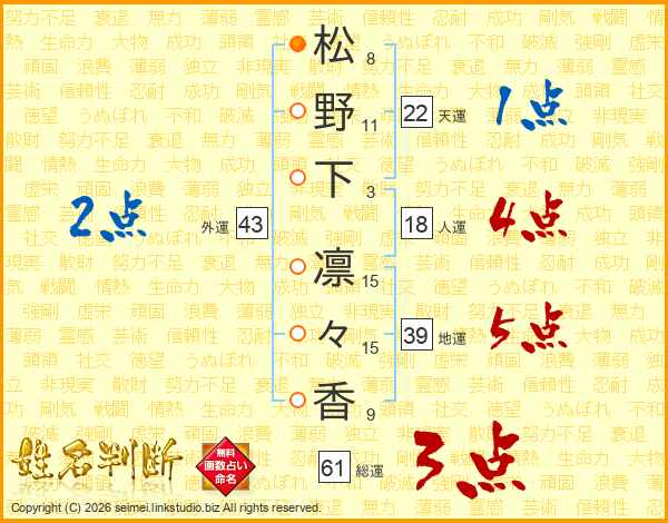 松(8画)野(11画)下(3画) 凛(15画)々(15画)香(9画)