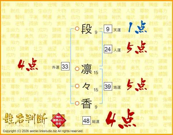 生活面を象徴する運勢です。外部から受ける影響力を表し、結婚運、家庭運や職場、環境への順応性を表します。総運から人運を引いた画数。姓や名が1文字の場合を除く。