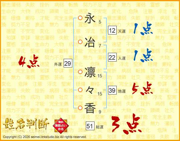 永(5画)冶(7画) 凛(15画)々(15画)香(9画)