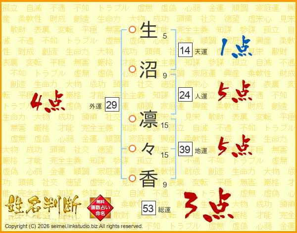 生(5画)沼(9画) 凛(15画)々(15画)香(9画)